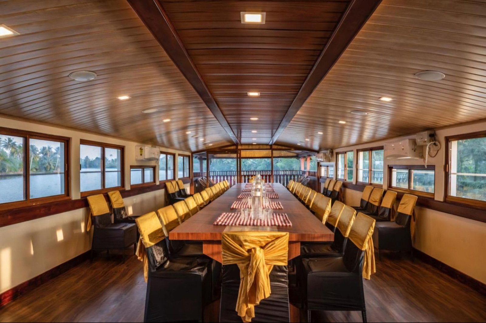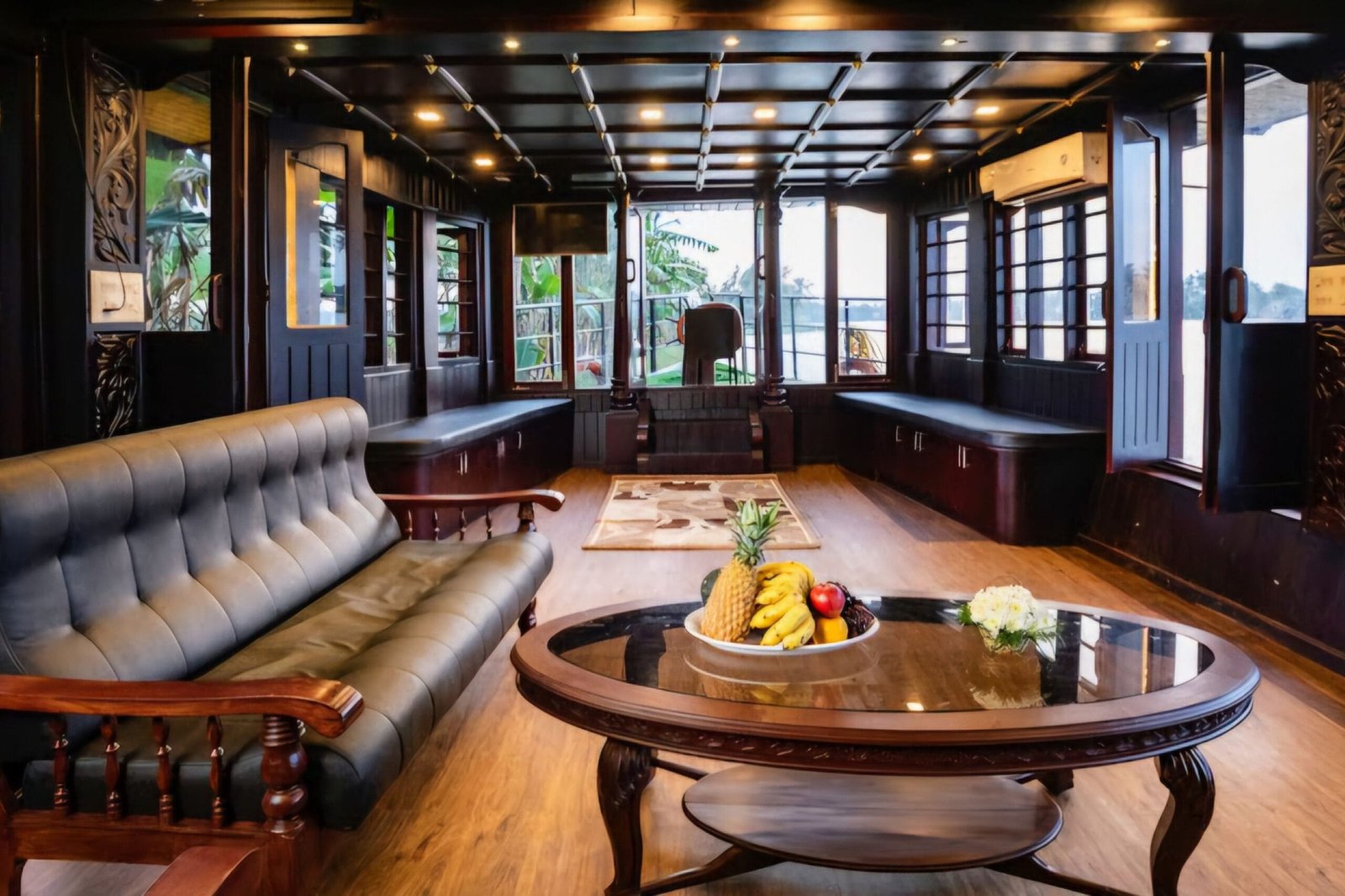 Experience the best premium houseboat in Alleppey-Kumarakom with our 6 Bedroom Premium Houseboat. This premium boat house in Alleppey-Kumarakom combines traditional charm with modern comfort, offering full-time AC, a customized food menu, an upper deck for stunning views, private bathrooms, a TV in the dining area, and a music system. Perfect for large groups or families, this 6 bedroom premium boat house accommodates up to 18 adults. Enjoy the serene backwaters on the best traditional premium houseboat in Alleppey-Kumarakom, blending nature’s beauty with the elegance of a traditional houseboat. Escape to our 6 bedroom premium houseboat in Alleppey-Kumarakom for an unforgettable and luxurious experience.